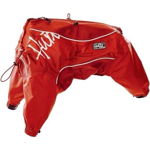 Pup Crew hundeklær sett bestående av en rød quiltet jakke med svarte detaljer og trykknapper, samt en rød- og hvitstripet strikket genser med julemotiv. Jakken har borrelås for enkel påkledning og er laget for å holde hunden varm. Genseren har et dekorativt ansikt med dusk, egnet for kalde dager. jakke 27cm genser 21cm