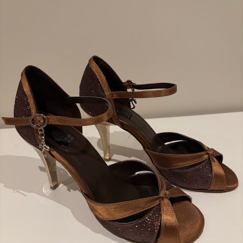 Helt nye latinsko selges videre pga feil størrelse. Står 37, men vil si de er en smal 36, sålen måler 23,5 cm på det lengste. Hæl ca 4 cm. Hvite med overflate i sateng. Justerbar reim, se bildet. Kjøpt på nett.