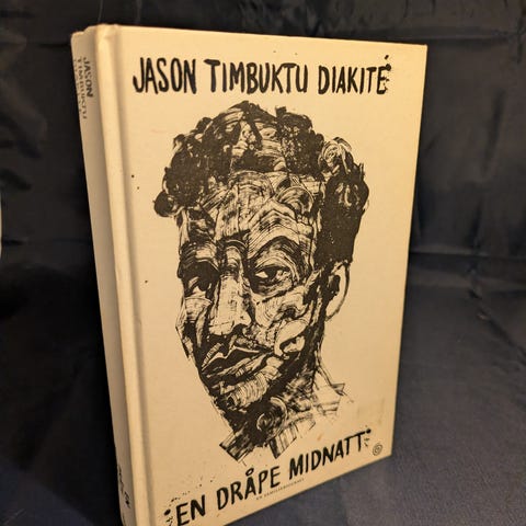 David Diop At Night All Blood Is Black bok. Roman skrevet på engelsk, oversatt av Anna Moschovakis, med temaer som rase, maskulinitet og kolonialisme. Boken er i standard bokformat med blågrønn omslagsfarge og tekst på engelsk.