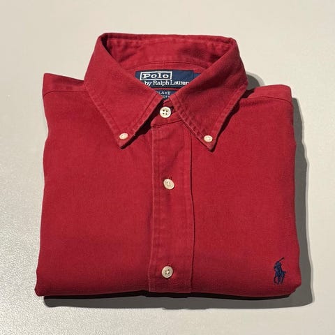 Langermet rød skjorte, oxfordmodell, i 100 % bomull fra Ralph Lauren. Størrelse L Tall, ekstra lang størrelse, passer til deg som har størrelse XL-XXL og er høy - "big and tall" . Se bildene för mål av skjorten - sammenlign med en skjorte du vet passer. Se og de andre annonsene mine, her finnes flere skjorter i lignende ekstra lange størrelser.