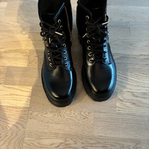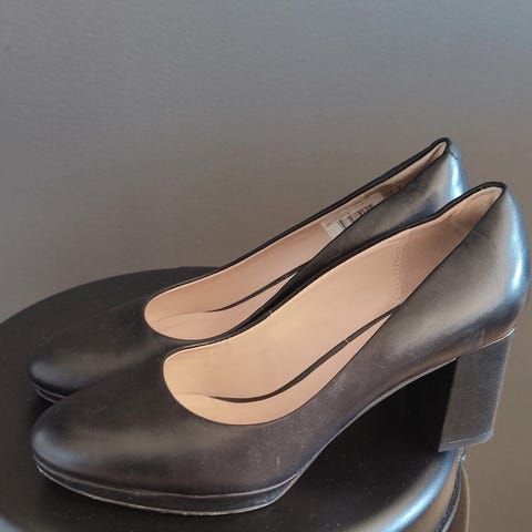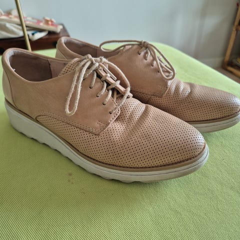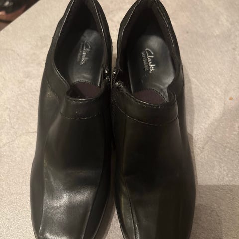 Clarks pensko i svart skinn, størrelse 37 for dame. Skoene har snøring og dekorative detaljer på overflaten. Brukt to ganger, for det meste innendørs.