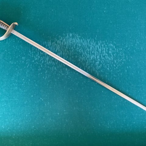 Ca. 63 cm lang ,Ca.3,1 cm bredde dobbelt egget blad . Ca. 13 cm håndtak, Ca. 49 cm blad.