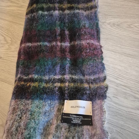 Holzweiler Mohair Alpaca skjerf i flerfarget design. Skjerfet er laget av en blanding av mohair og alpaca, som gir varme og mykhet. Nydelige rosa og grønn toner. Skjerfet er blitt brukt kun et par ganger.