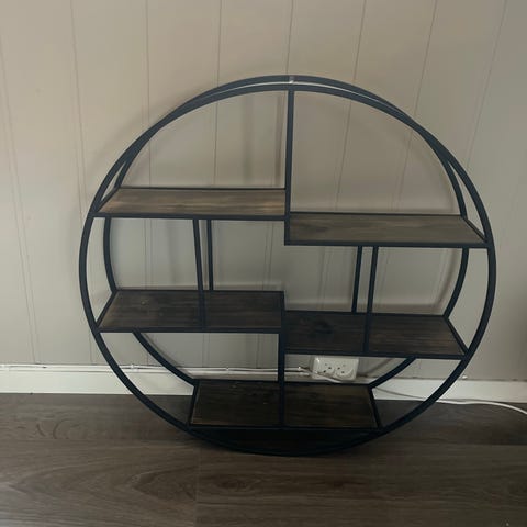 Pen hylle hengt på soverom med utstilling av figurer. Flere bruksområder, eks bad eller vaskerom.