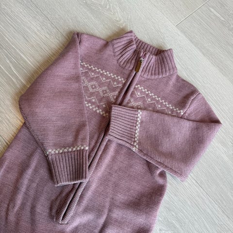 Meri Fairy Barnedress i rosa, størrelse 80/86 .Dressen har hette og glidelås foran, med mønsterdetaljer på bryst og er laget i myk Merinoull som gir komfort for barnet.