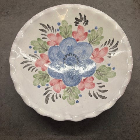 Blått fat og mugge med sol. Fatet er ca 32cm i diameter, og kan henges på veggen eller brukes som kakefat. Muggen er ca 20cm høy og har pålagt sol på ene siden, og er helt blå på andre siden.