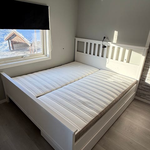 Madrassen har et trekk i hvitt stoff som er steamet, overmadrassen er vasket og ingen flekker. Perfekt som gjesteseng eller til barnerom/studenthybel.