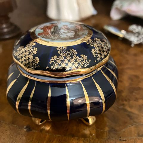 Lite retro gammelt skrin i porselen med avtagbart lokk. Uten skår. Selges