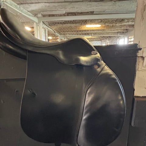 Mener den er str 17 i setet. Minimalt brukt her hos meg. Brukt på kaldblods. Utskiftbart bomjern, mulighet for å flytte knestøtter. En liten kosmetisk skade (se bilde). Cair luftputer.