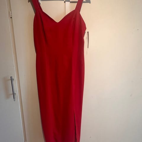 Klassisk og elegant kjole, merke Kello. Den er enkel og stilren, fotside til en på 1,67. Figursydd, med splitter nederst. Stoffet er litt blankt, perfekt julebordskjole!