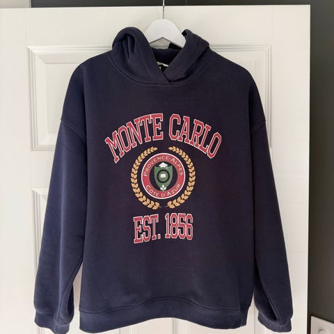 H&M Monaco hettegenser i størrelse S. Genseren er laget i mykt materiale og har hette med snøring. Passer til hverdagsbruk for dame/ungdom