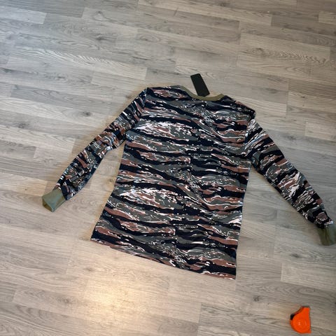 Bukser med camo mønster i grønt, hvitt, svart og grått. Designet med flere lommer, inkludert sidelommer og cargo lommer. Passer til uformell bruk og utendørsaktiviteter.