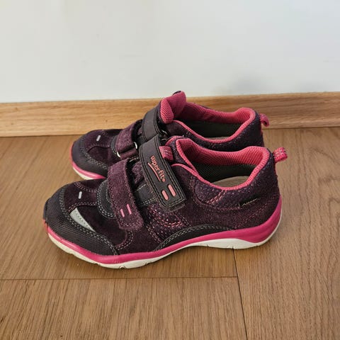 Overgangssko fra Superfit som passer til høst og vår, med Goretex. Lilla med rosa detaljer. Delvis semsket. Pent brukt.