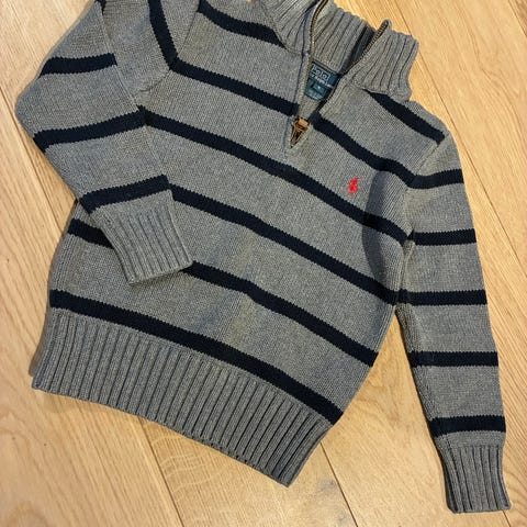 Tommy Hilfiger barnegenser i størrelse 92, designet for gutter. Genseren er blå og har en strukturert strikk med ribbestrikkede kanter ved ermer og midje. Den har en høy hals med glidelås i front og et lite Tommy Hilfiger-logo brodert på brystet.