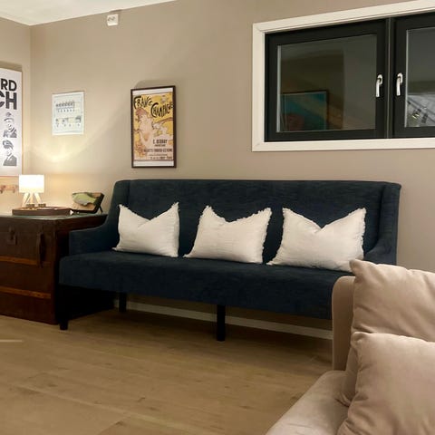 Ingen flekker på stoffet, men noen slitasjemerker på beina (kan pusses/males).