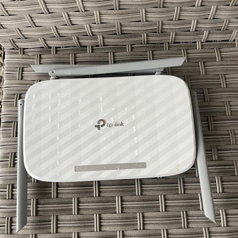 TP-Link Archer Router med tre antenner, svart farge. Enheten har flere Ethernet-porter for kablet tilkobling og er designet for trådløs nettverkstilkobling i hjem eller kontor.