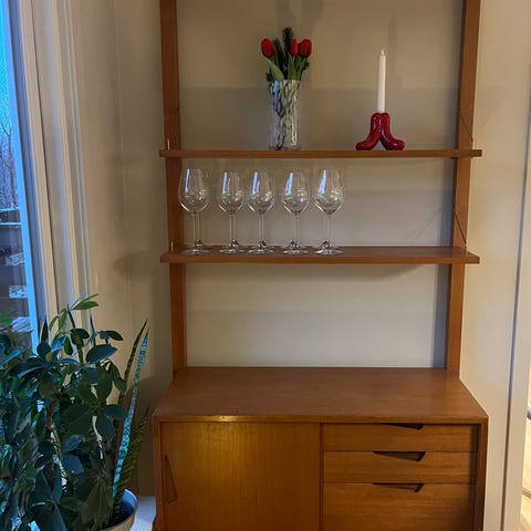 Vegghengt hylle med skap i teak, bestående av flere hyller og skap med skyvedører. Hyllene har en kombinasjon av åpen og lukket oppbevaring med plass til dekorative gjenstander eller bøker. Skapet har skyvedører i tre og glass. Møbelet har et retro design og er egnet for oppbevaring og visning i stue, kontor eller andre rom.