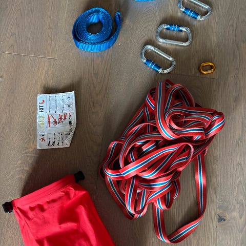 Slakkline fra slakkline.no / house of hygge. Størrelse small, dvs 15m lengde. Greid å miste den ene slyngen, en karabiner og låse-dingsen fra opprinnelig oppsett, men brukt en klatreslynge med en klatrekarbin for siden med løkke, og en snabblenke/maillon som låsedings og ikke hatt noen problemer med det oppsettet.