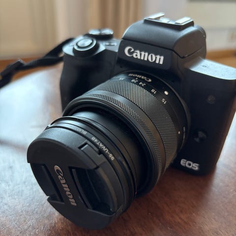 Canon EOS 50 Mark II systemkamera med 25,8 megapiksler APS-C-sensor og vari-angle berøringsskjerm. Kameraet støtter 4K-opptak og har EF-M objektivfeste. Inkluderer integrert WiFi for trådløs tilkobling.
