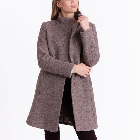 Marie Philippe i blå farge, størrelse M. Plagget har belte i livet. 50% merino ull, 50% polyester.