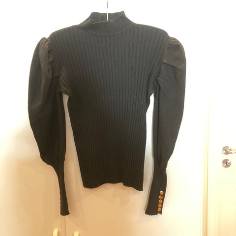 Balmain genser i svart farge, størrelse 36 for damer. Genseren har lange ermer og dekorative gullknapper på skuldrene. Materialet er ribbestrikket, noe som gir en elastisk og tettsittende passform.