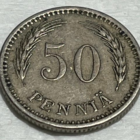 Finland 50 Pennia mynt fra 1963. Mynten er laget av metall og har en diameter som passer standard mynter. På forsiden er verdien 50 Pennia og et tre motiv, mens baksiden viser en løve og teksten SUOMEN TASAVALTA med årstallet 1963.