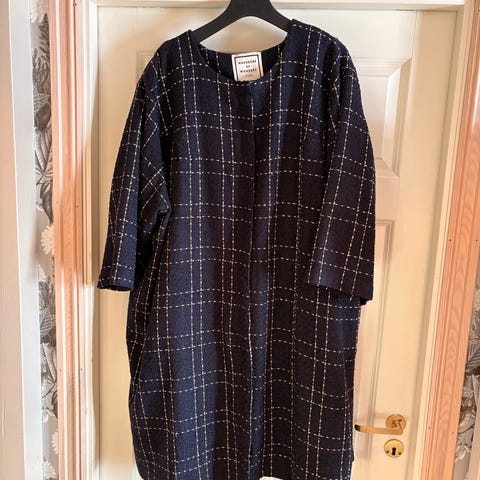 Jakken har A-form og skrår litt ut nede som et skjørt. Den har en slankende siluett og er veldig flatterende på.