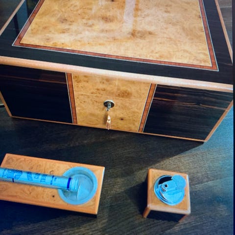 Sigar humidor selges, vært brukt til smakstilsatte sigarer, hygrometer fungerer ikke lenger og har noen kosmetiske skader, se bilder.