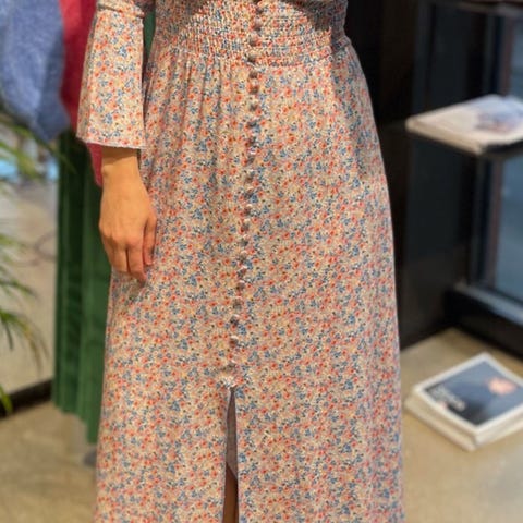 Americandreams Koko Sommerkjole i størrelse XS, flerfarget med blomstermønster i rødt og rosatoner. Kjolen har korte puffermer med smock, V-hals, flowy skjørt og åpen rygg. Laget av 100% viskose, egnet for sommerbruk. Helt ny med lapp på.