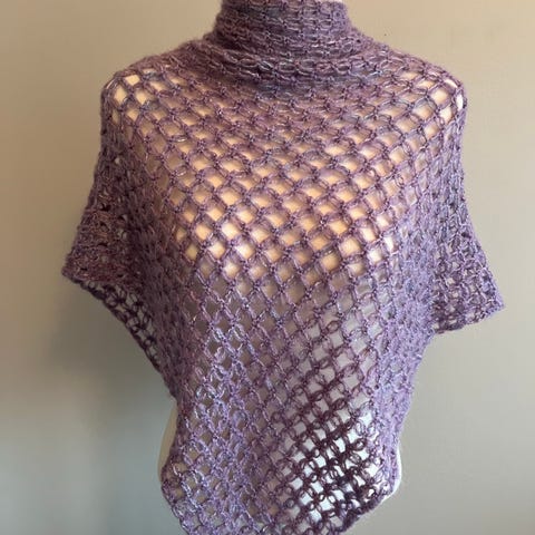 Poncho, sjal, skjerf heklet i englemasker, kjærlighetsknuter selges. Garn Ulla, lilla i 75% ull og 25% polyamid. Har heklede poncho og sjal i mange ulike farger og garntyper. Kan sendes mot at kjøper betaler porto.