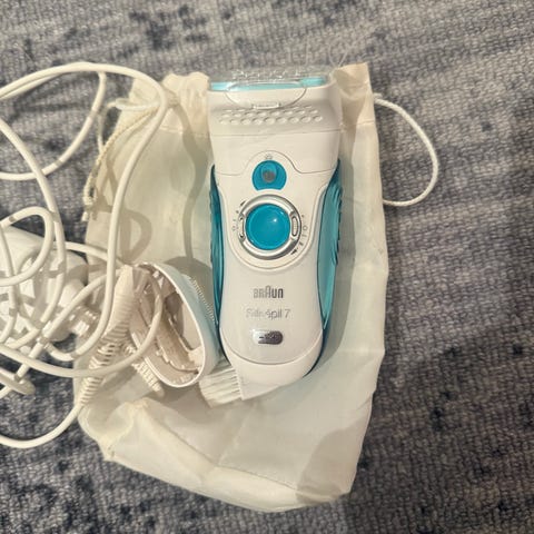 Epilator og barberhøvel i ett! Vanntett, kan derfor brukes i dusjen. Kun brukt 2-3 ganger på leggene, har deretter bodd i skapet🙃 Følger med mye tilbehør, inkl. lader og oppbevaringspose. Det ene høvel-hodet har fått seg et lite kakk (selges derfor billig!), men tror ikke dette har noe å si for bruken. Les mer her: https://www.power.no/skjoennhet-og-velvaere/haarfjerning-for-kvinner/epilator/braun-silk-epil-9-9-730-epilator/p-2090954/
