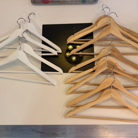 Til salgs: Røde kleshengere fra IKEA-serien GARDVIK (utgått). Formen er bred med hvite knotter som holder klærne godt på plass – perfekt til kåper og dresser. Serien attribueres Monika Mulder, en mangeårig IKEA-designer. Pent brukt og i svært god stand.