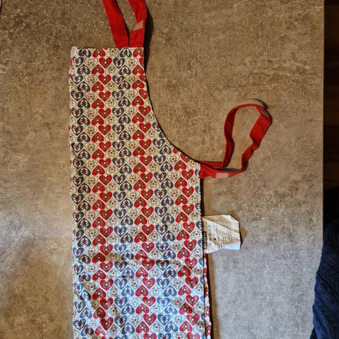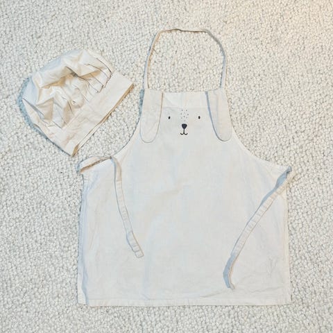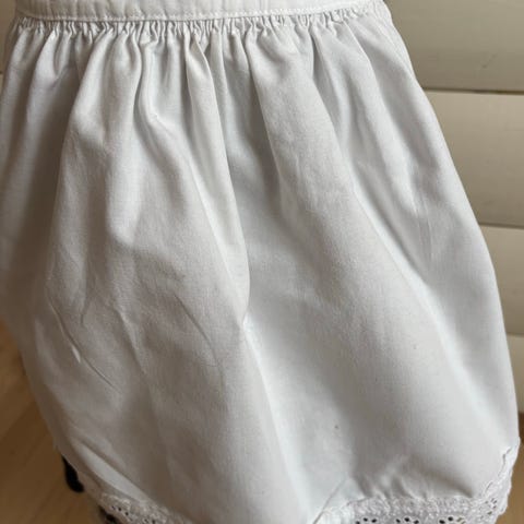 Forkle og kokkelue til barn. Står ikke størrelse, men ble brukt her i alderen 4-7 år. Kan sendes.