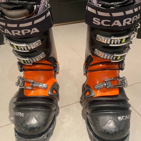 Telemark sko som er brukt noen vintere, i god stand, ingen feil eller mangler. De er størrelse 26 (ca 40,5) sålen er 26 cm lang, de er veldig gode støvler den stiveste modellen til Scarpa, med gåmodus funksjon bak helen. De passer i NTN bindinger som Rottefella Freeride og Freedom eller 22designs Outlaw og Bandit. Innerstøvelen kan varmes og formes til foten flere ganger ved behov for at den skal passe foten best mulig.