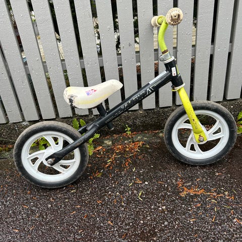 AI-beksrivelse: Balansesykkel i svart farge, designet for barn. Sykkelen har justerbart sete for tilpasning til barnets størrelse. Den er laget med solide materialer og har hjul uten pedaler for å hjelpe barn med balanse og koordinasjon. Godt brukt!