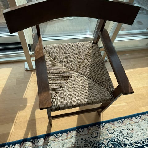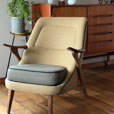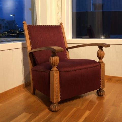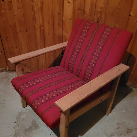 Fin eldre stol selges. Den er trukket om og renovert, men trekket har løsnet bak og i ryggen. Den kan enten trekkes om igjen eller fikse trekket som allerede er på. Stolen er god å sitte i.