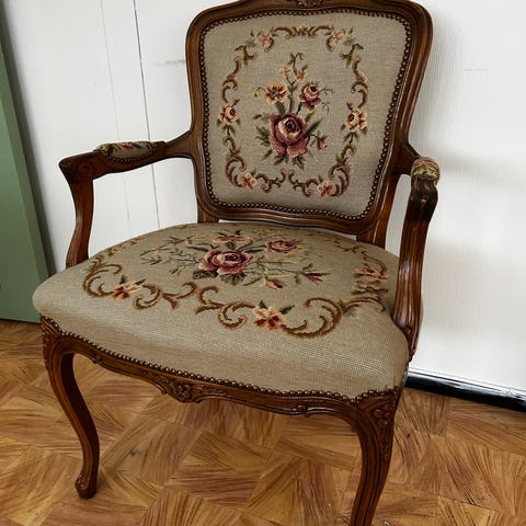 Selger et par flotte rokokko-stoler i klassisk Louis XV-stil, trolig produsert i Europa på 1960–70-tallet. Stolene har utskårne detaljer i massivt treverk og er trukket i gobelinstoff med romantiske motiver.