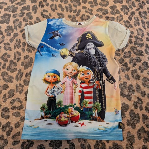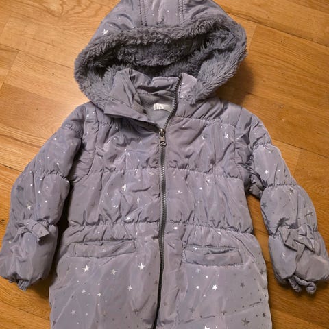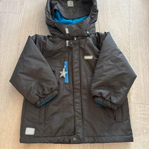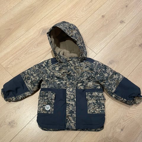Vinterjakke til barn i mørkegrønn farge med dinosaurer mønster. Har hette og er foret med fleece på innsiden. Meget pent brukt - ingen bruksmerker