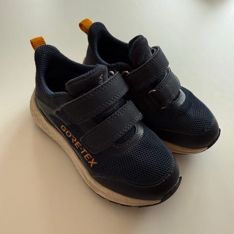 Viking Goretex barne joggesko i størrelse 25, designet for jenter. Skoene har en blå farge og er laget med Goretex-materiale som gir vannavstøtende egenskaper. De har borrelås for enkel justering og påkledning. Sålens design gir godt grep og komfort for aktiv bruk.