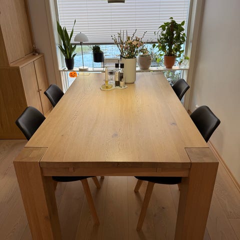 Hvitoljet eik, hvite ben. Med tillegsplate på 50 cm. Spiseplass til 8 uten plate, 10 med tillegsplaten. Solid, massivt bord som kan slipes til natur eik eller behandles.