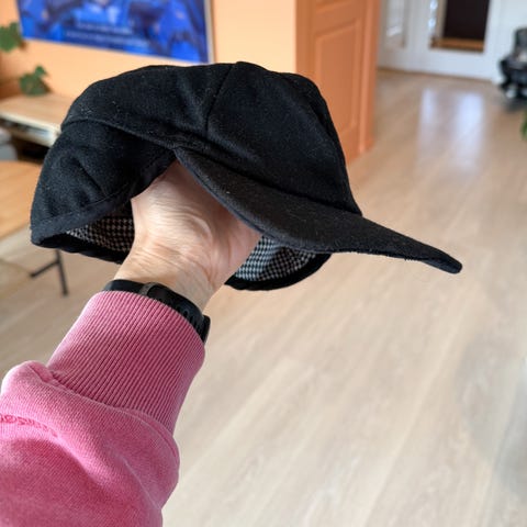 Som ny. Nydelig rødfarge. Praktisk ørevarmerdel som kan trekkes ned når det er kaldt eller has opp hvis lua skal brukes som caps.