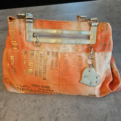 Vakker vintage GUESS Stoff Dame Veske i olivengrønn med beige detaljer. Vesken har en skulderrem med metallspenner og et dekorativt metallplate med GUESS-logo på fronten. Innvendig foring med glidelåslomme. Materiale: stoff med kunstlærdetaljer.