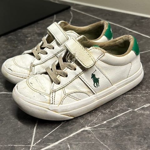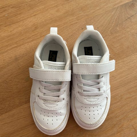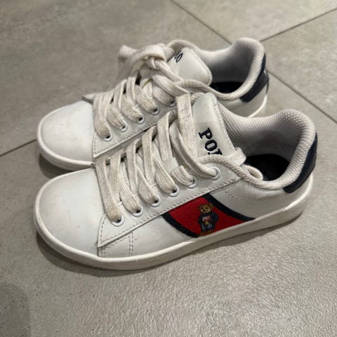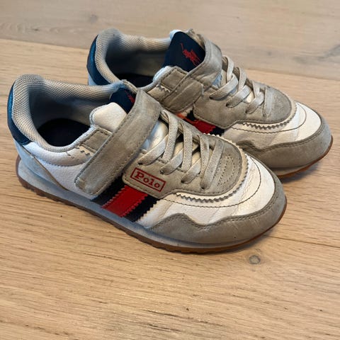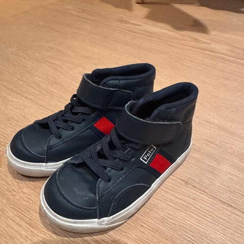 Polo Ralph Lauren barn sko i størrelse 30, designet for gutter. Skoene er blå med røde og hvite detaljer, og har borrelås for enkel lukking. Laget i syntetisk materiale, egnet for daglig bruk.