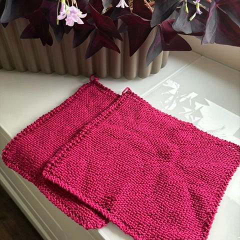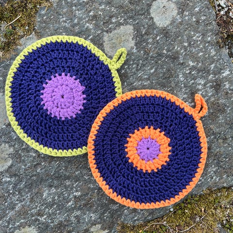 Heklet grytekluter selges. Brukt bomullsgarn fra Sandnes garn og Gjestalgarn.