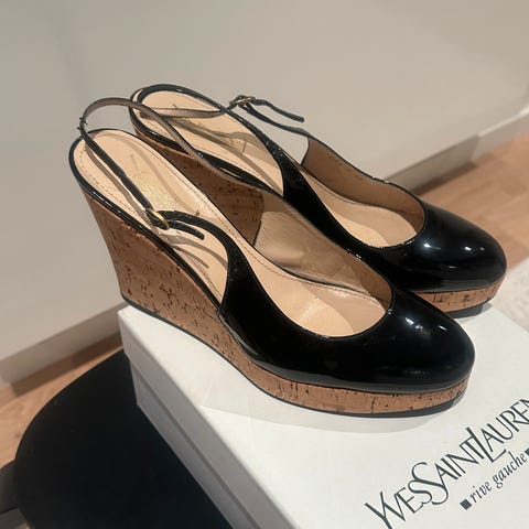 1. Vintage YSL sandaler fra Pilati-æraen , i sort lakk med bred ankelrem og messing-detaljer. Elegant og edgy design som er typisk for Yves Saint Laurent før navneendringen til Saint Laurent Paris. . Pilati-designene er sjeldne å finne i dag, og disse er ekte vintage-cult fra 2010-tallet. Pent brukt, med normal slitasje under såle. Overdelen i meget god stand. Str. 39,5. Ny pris: Ca. 7500,-, selges for 2500,-