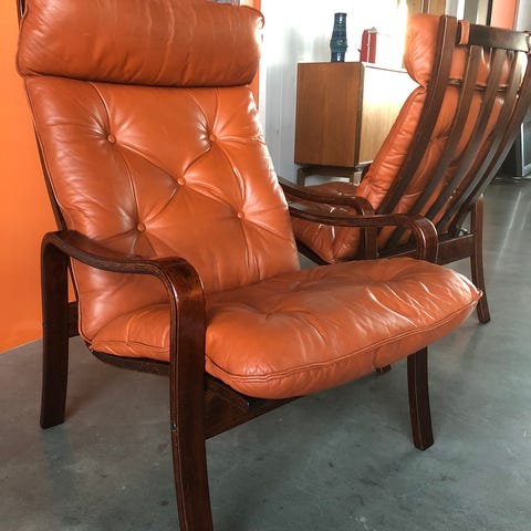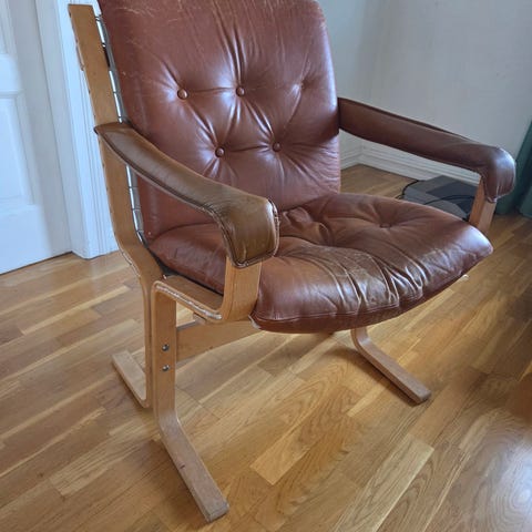 Denne er i formpresset Bøk - med pute i Cognac farget Anilinskinn -å fremstår i flott stand