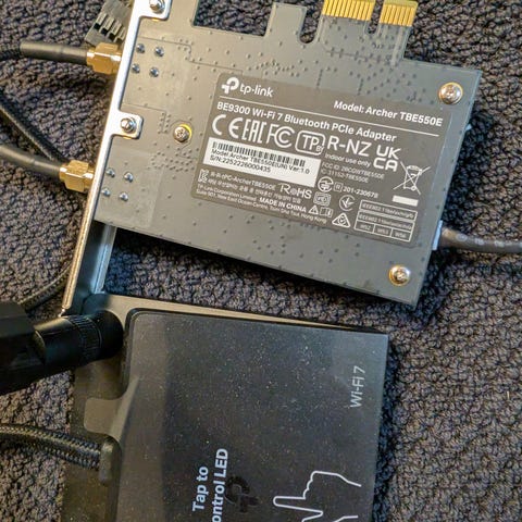 TP-Link Archer TBE550E nettverkskort med Wi-Fi 7-støtte og Bluetooth 5.4, svart farge. Antennene har en touch sensitiv plate så du enkelt kan skru av WiFi signalet. Designet for å gi trådløs tilkobling med høy hastighet til datamaskiner via PCIe-grensesnitt. Inkluderer to antenner for forbedret signalmottak og stabilitet.