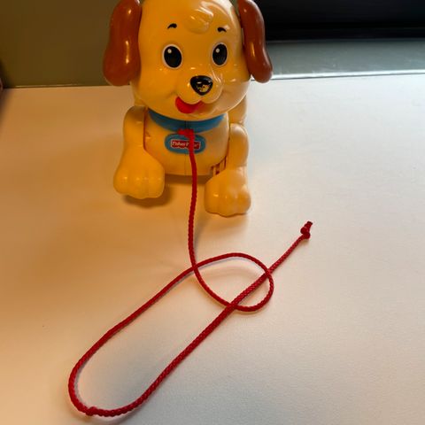 Når leken trekkes, vrikker den på ørene, logrer med halen og lager en klikkelyd.