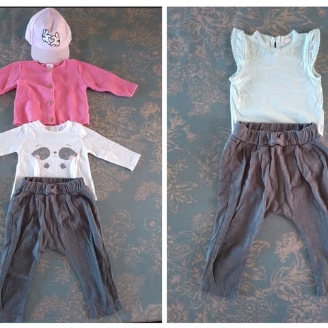 Selger en variert pakke med søte babyklær i str. 68–74. Perfekt miks av hverdagsklær, pysj og sett.