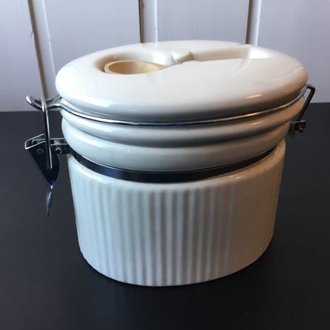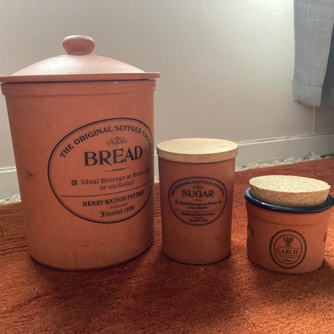 Oppbevaringkrukker av keramikk til brød med dreid trelokk og til mel med korklokk